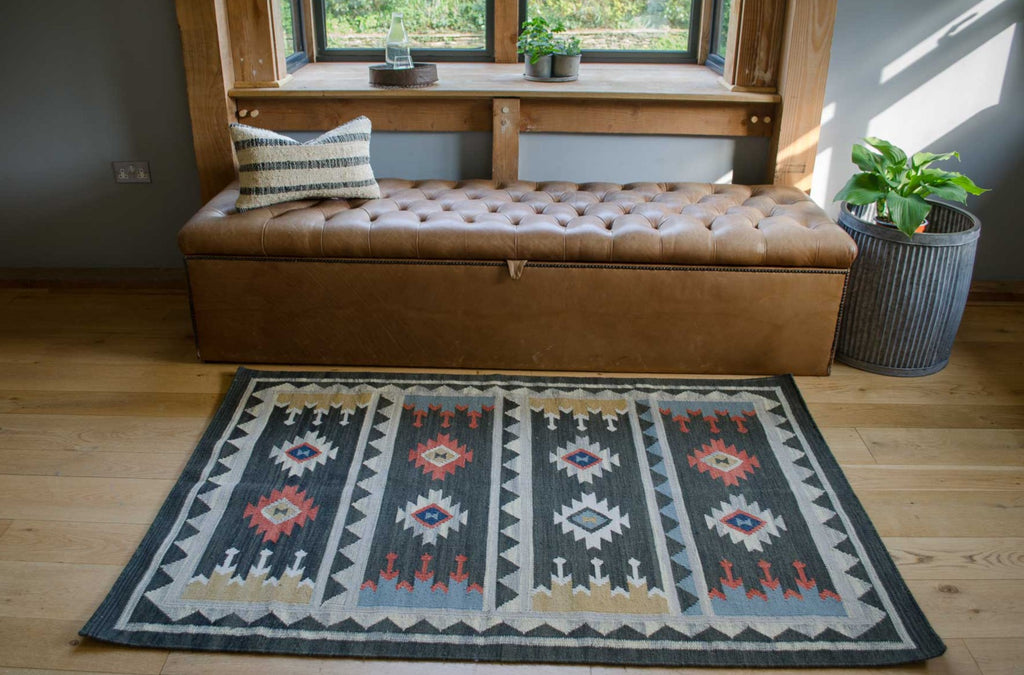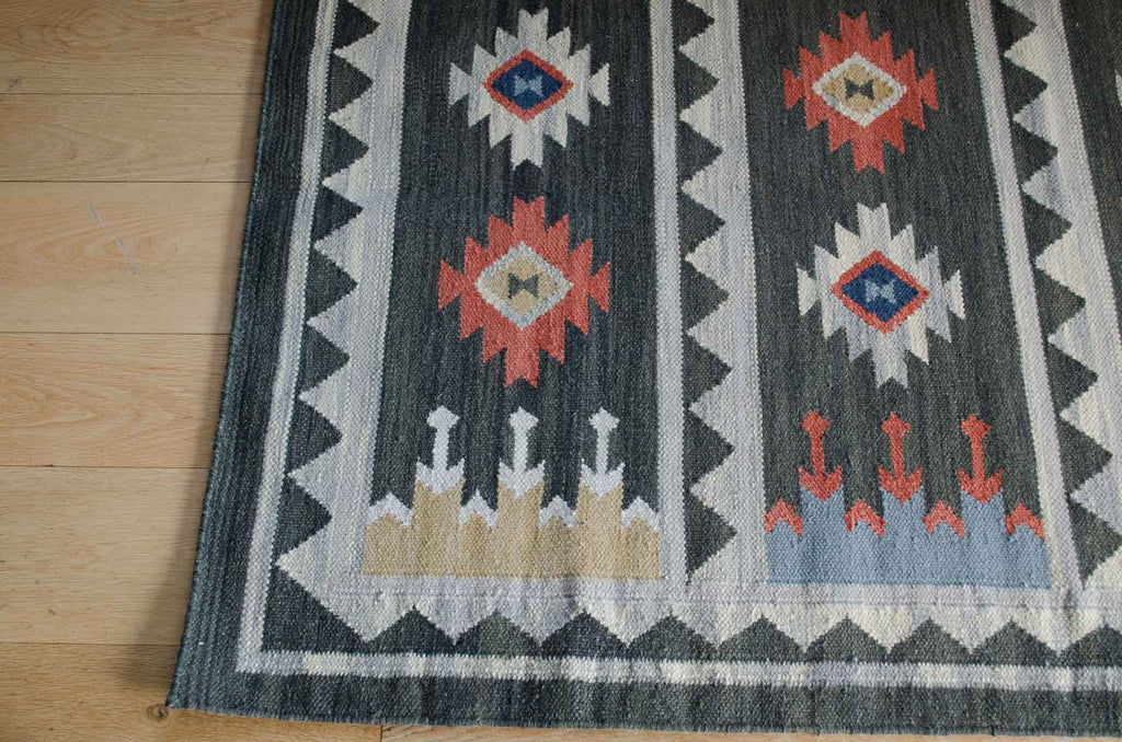 A beautiful flat weave wool and cotton rug with a traditional Kilim design in blues, rusts and golds with a charcoal background, giving it a modern twist on a traditional design. Handwoven by skilled craftsmen using traditional methods. Team with one of our grey blankets for a new look this season.
