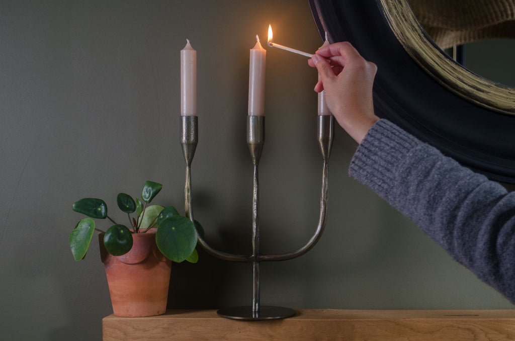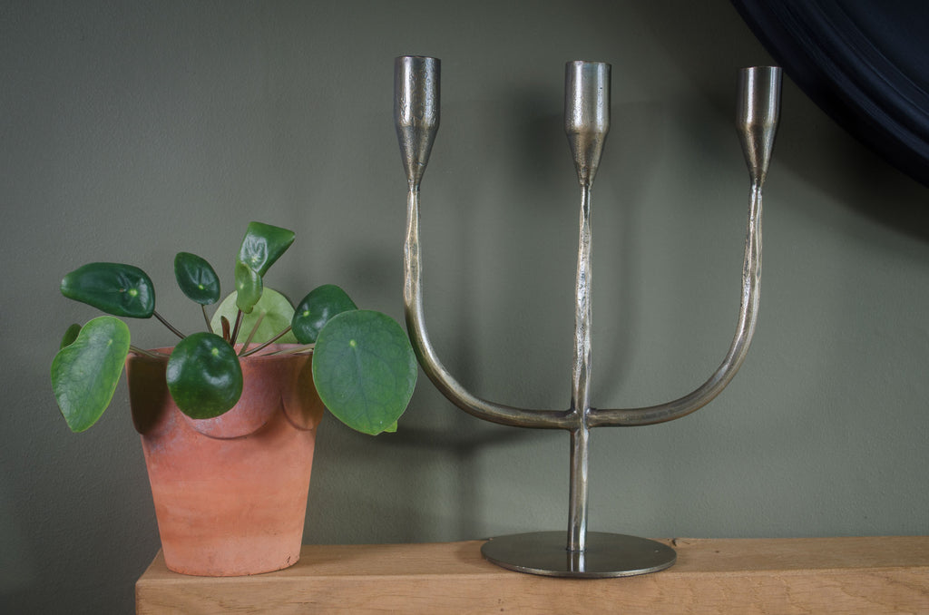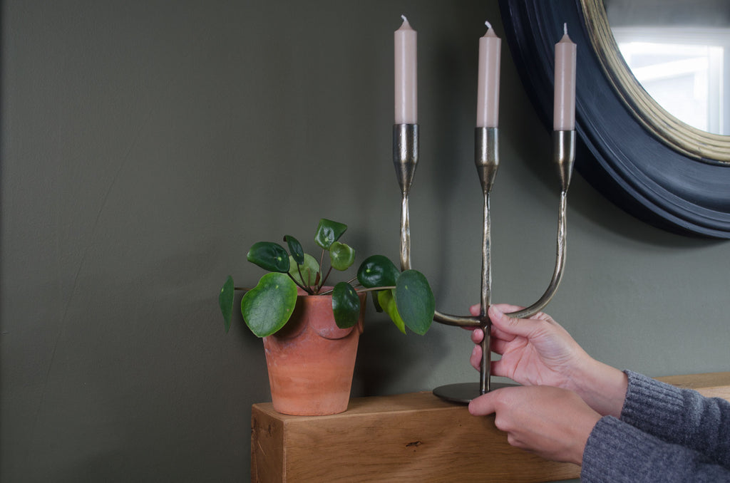 These handcrafted antique brass effect triple candlesticks with 3 standard dinner candle size holders, are perfect for creating a warm and cozy atmosphere. Ideal for dining tables, mantels, or living room accents, they pair beautifully with both modern rustic interiors. Team up with our short dinner candles for the finished look