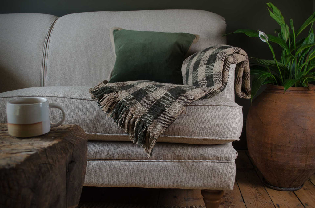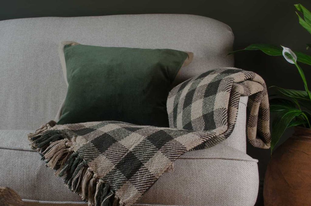 Bring subtle colour and sustainable comfort to your home with this recycled cotton washable blanket. Woven from 80% recycled cotton, this eco-friendly throw features a timeless check pattern in either nordic blue or sage green colourway and is lightly brushed on the reverse for a softer luxurious feel. Add texture and colour draped over a sofa or folded at the end of the bed teamed with our velvet cushions. Machine washable at 30oc