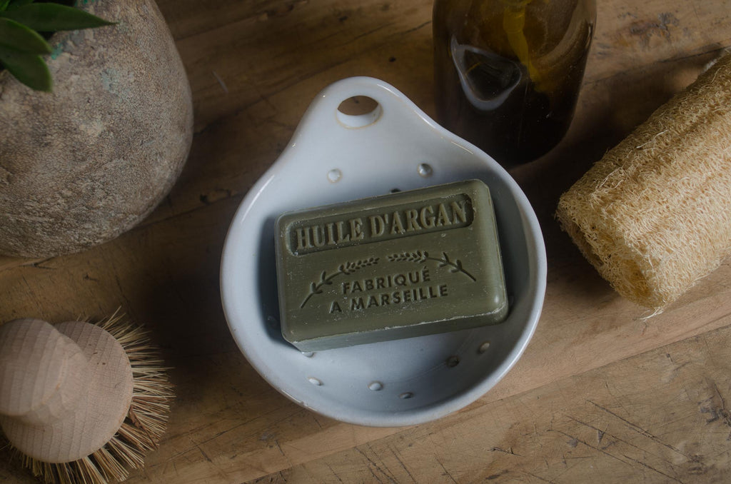 Handthrown white ceramic strainer bowl, perfect as a soap dish or next to your kitchen sink for your washing up accessories. Each piece is uniquely crafted, featuring a smooth glazed finish and drainage holes that keep soap dry and fresh. The perfect piece for a rustic farmhouse, or contemporary kitchen. This functional yet elegant ceramic dish brings style to the everyday or would make a great gift teamed with our French Market Soaps