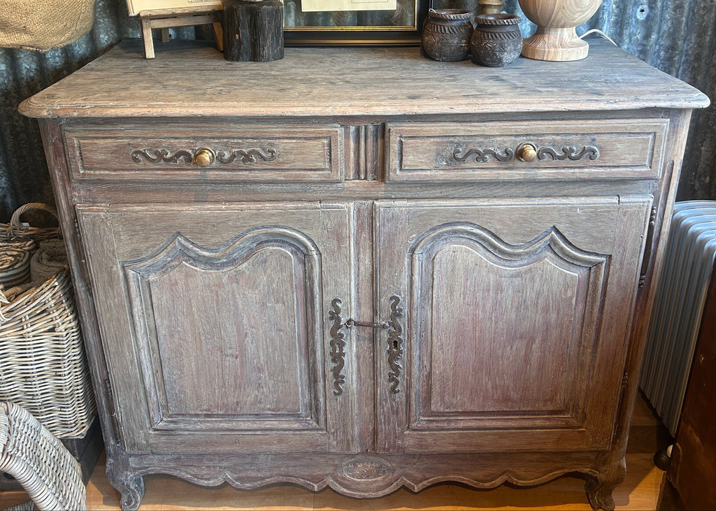 Antique 19th Century French walnut sideboard finished in a soft lime wash that highlights the natural character of the walnut grain, this piece showcases classic French provincial detailing — from its scalloped base to the beautifully carved panel doors, all constructed from solid wood. Original brass fittings and hardware highlight its authenticity, while the interior features a removable shelf for adaptable storage & 2 drawers above. Perfect as a dining room buffet, living room cabinet, or entryway statement piece, this sideboard blends effortlessly into French country, rustic, or vintage-inspired interiors.