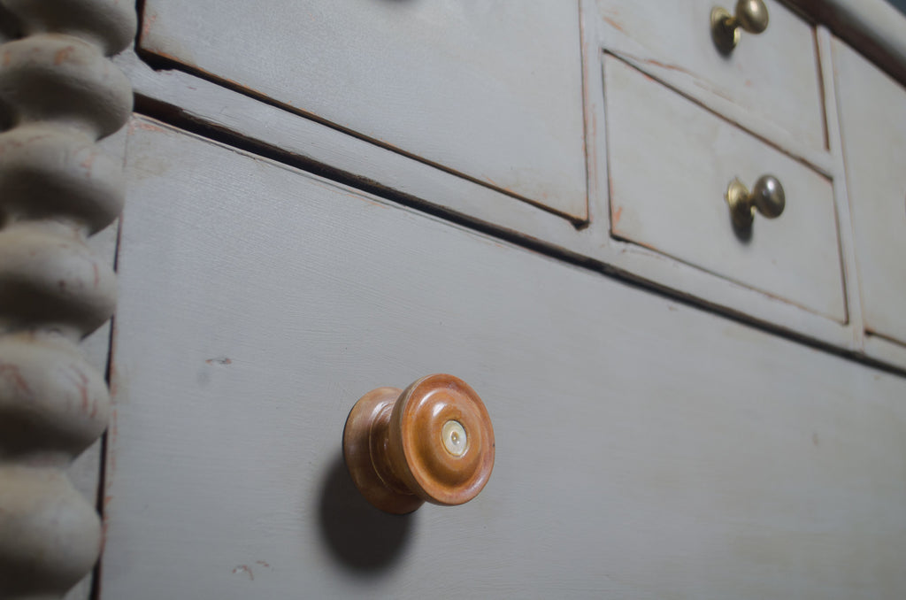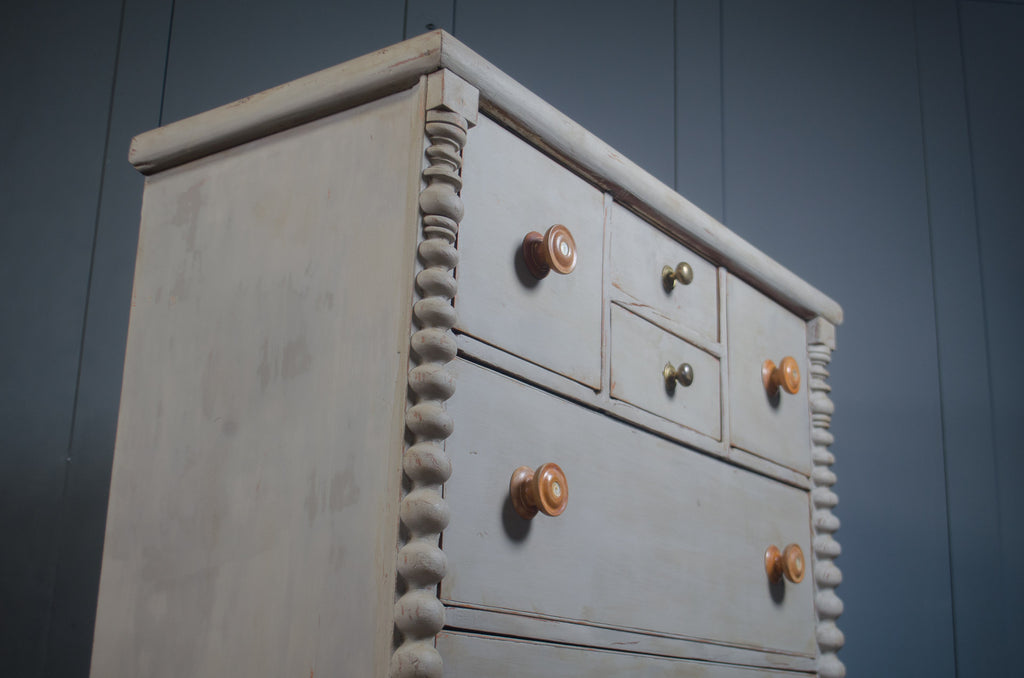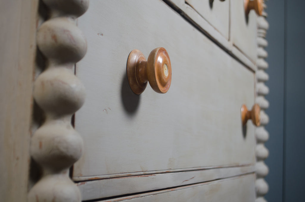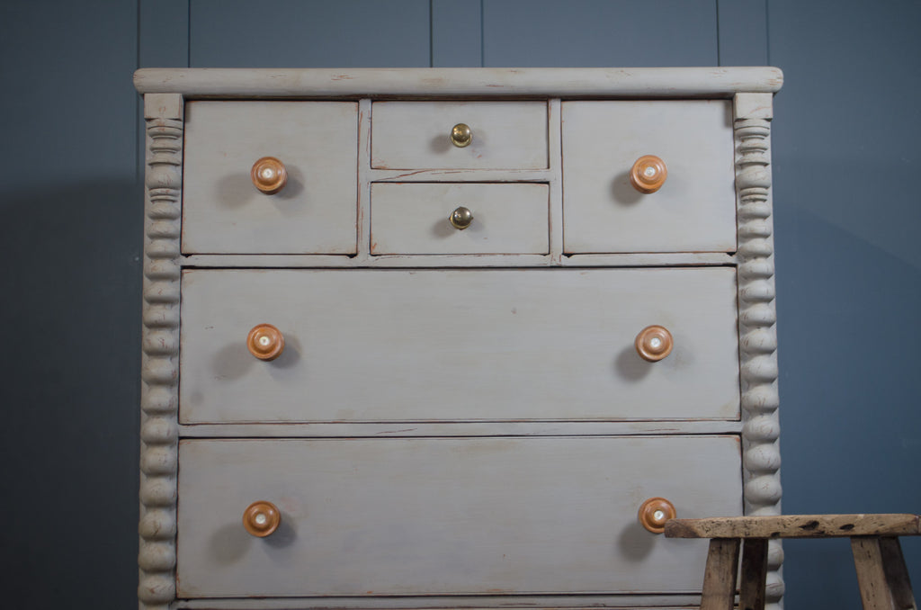 A beautifully proportioned 19th century Australian cedar chest of drawers, showcasing timeless colonial craftsmanship. Constructed from solid cedar, this piece features a classic arrangement of drawers with charming hand-turned timber knobs with mother of pearl centres and distinctive carved side columns. Finished in a soft French grey painted finish with soft ageing & wear. A practical and decorative chest that offers generous storage while bringing a calm, heritage feel to any interior.