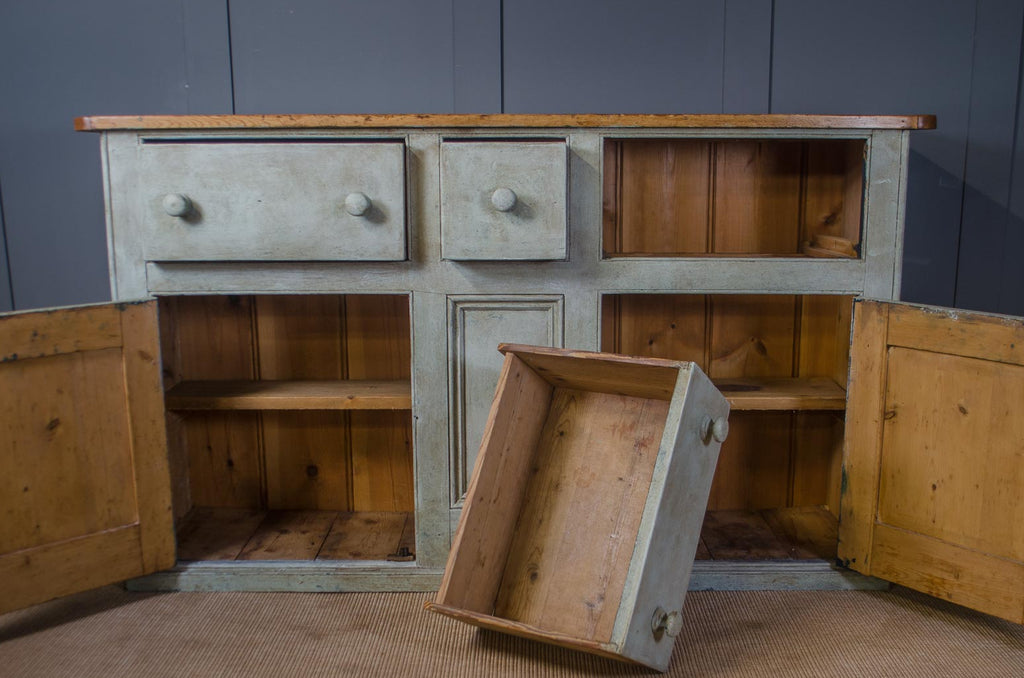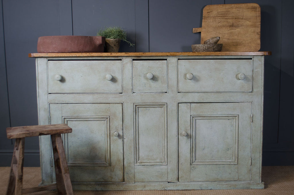 Original Victorian country farmhouse pine sideboard with an aged, distressed painted base in a soft, worn duck egg blue. The proportions are classic and practical, with a traditional arrangement of drawers, over cupboard storage. Ideal for cutlery, linens, crockery, or general household storage. The panelled doors and simple wooden knobs keep the look firmly rooted in rural Victorian utility, making it easy to place in a country kitchen, dining room, boot room, or hallway. A solid, very usable, original sideboard with a calm duck egg finish and plenty of presence, handsome, understated, and made for everyday living.