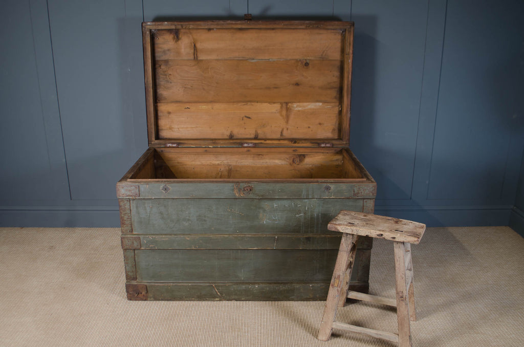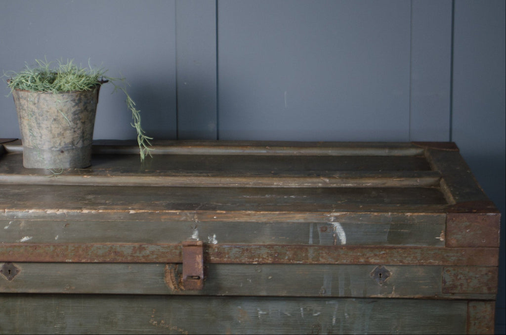 A striking large antique vintage military chest, featuring iron fittings and a beautifully worn original distressed green painted finish. Originally used for military or transport use, this substantial trunk is reinforced with iron corner mounts and metal banding, giving the piece both strength and industrial character. The front latch and hardware further enhance its utilitarian look while adding authentic vintage appeal. The spacious interior, makes it perfect for storing toys, logs, or household items. Waxed and polished ready for a new home.