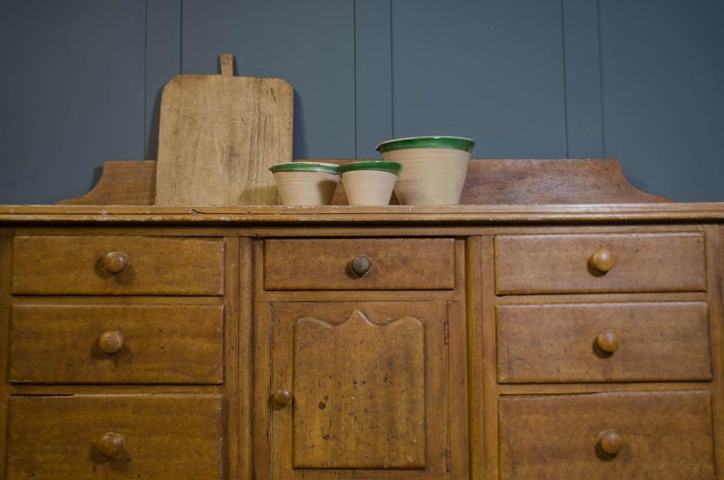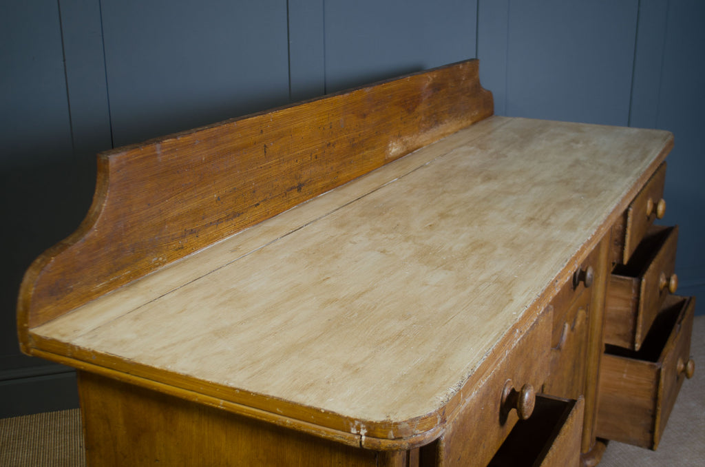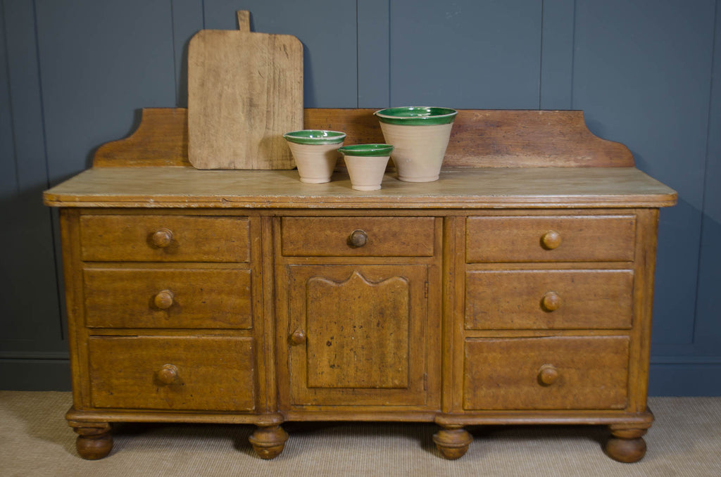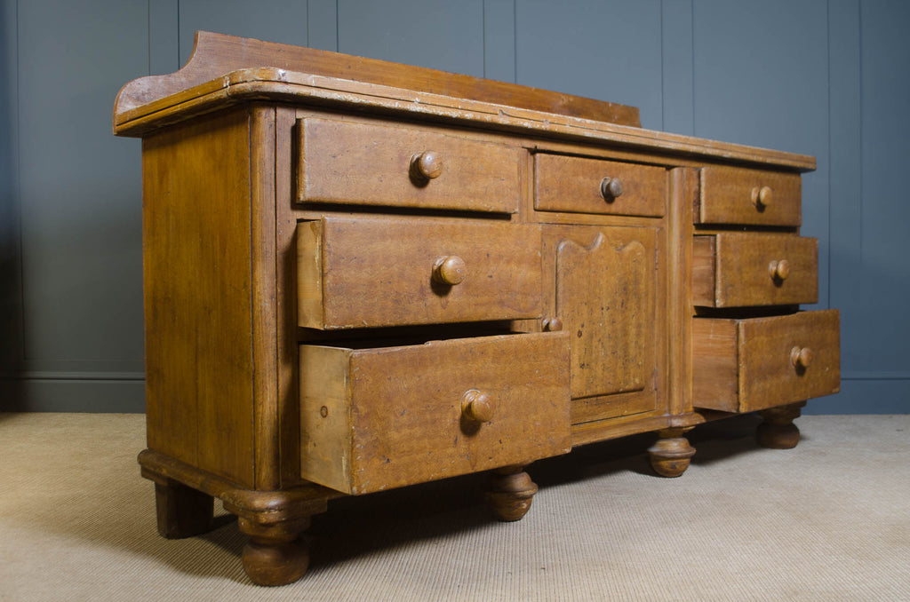 A large-scale antique Victorian sideboard of impressive proportion, raised on distinctive acorn bun feet and retaining its original upstand to the rear. This 19th century piece offers both presence and practicality, with a classic arrangement of drawers flanking a central cupboard, all fitted with turned wooden knobs. The top has been finished in an aged paint, creating a beautifully layered, time-softened surface that complements the rich tone of the scumbled pine base. Solid, weighty and full of honest age-related wear, this Victorian sideboard works effortlessly in a rustic kitchen, dining room or period interior where scale and authenticity matter.