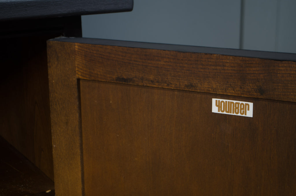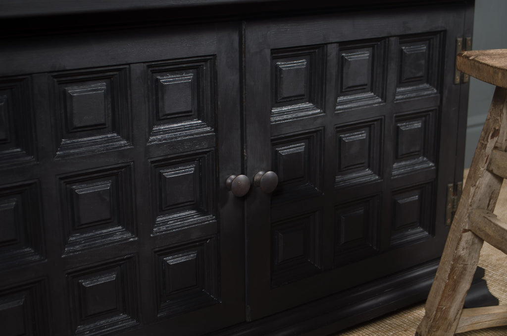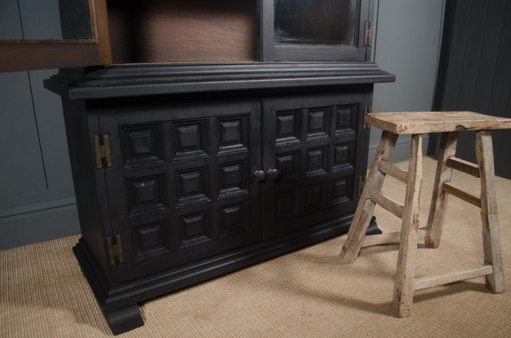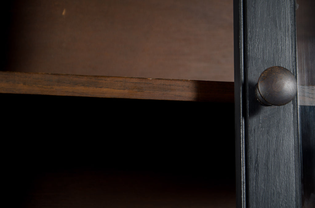 A bold and elegant mid century dresser, finished in a deep black lacquered finish that makes an immediate statement in any interior. With its tall proportions, glazed upper doors, and solid lower shelved cupboard, this piece brings strong architectural presence without overwhelming a space. The glass-fronted top section is ideal for displaying ceramics, glassware, books, or collected objects, while the enclosed storage below keeps everyday items neatly out of sight. Equally at home in a cleanline modern interior or a period property looking for drama, this cabinet works well as a display dresser, dining room storage, kitchen larder-style cupboard, or hallway statement piece.