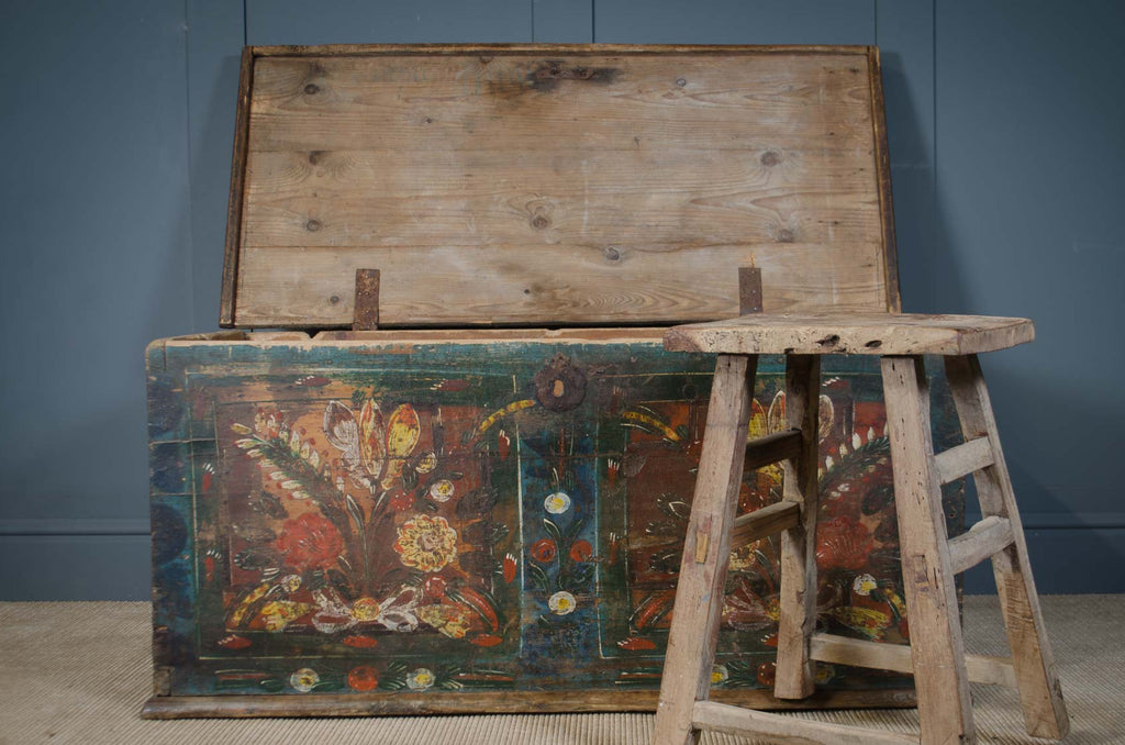 This beautiful antique late 1800s hand-painted pine chest is a wonderful example of traditional Hungarian folk art marriage chest. The muted aged painted panels feature stylized flowers and foliage typical of folk art designs from the Carpathian region, set against a deep green background that has developed a lovely aged patina over time. The interior provides generous storage and a hinged lid, making it both a practical and decorative piece for a lounge or bedroom. Signs of historical worm that has been fully treated as a precaution & the surface waxed to nourish the wood and bring out the gorgeous colours.