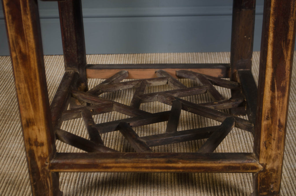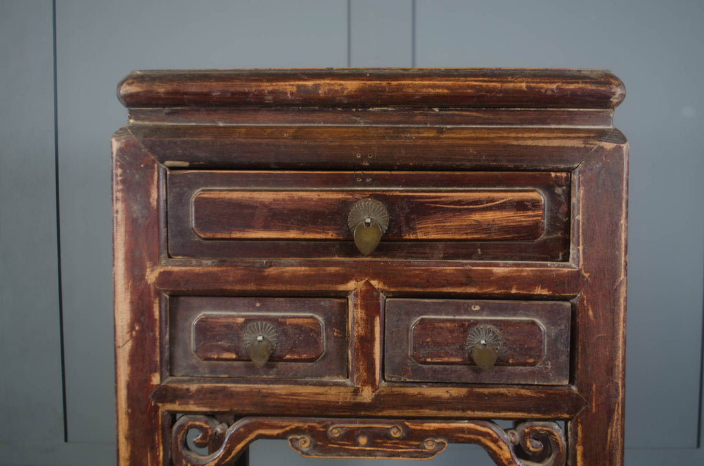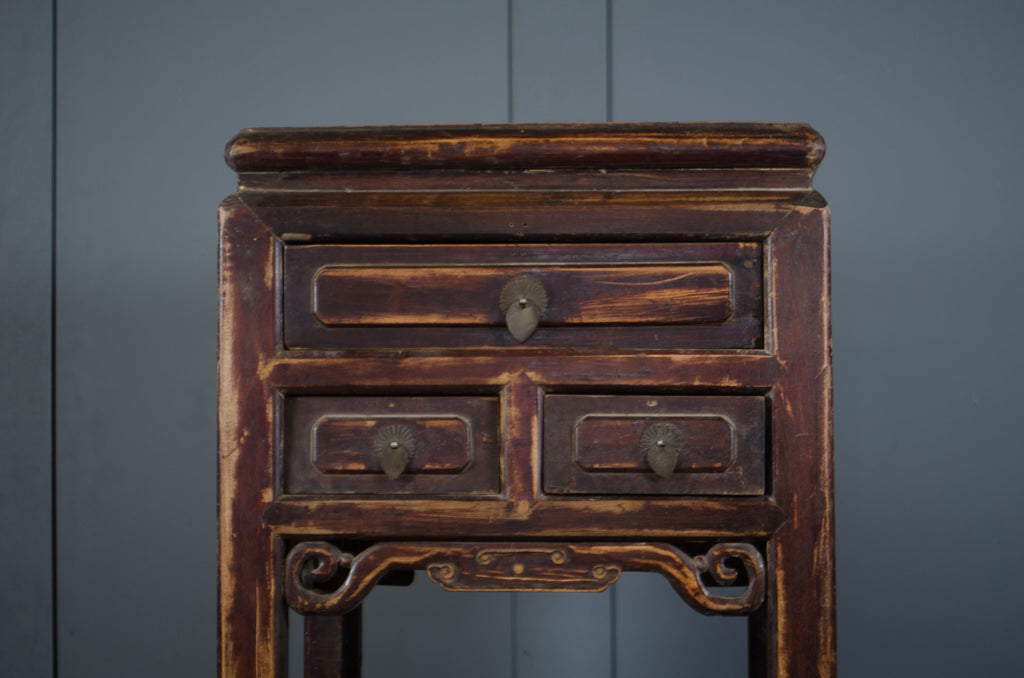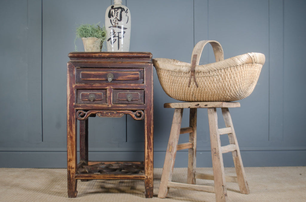 This 19th-century elm bedside table displays a deep, timeworn patina and classic proportions. With three drawers for practical storage and an open lower shelf, it’s a versatile & interesting piece suitable for bedrooms, hallways, or as a side table in living spaces.