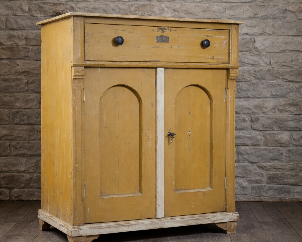 Antique reclaimed Eastern European sideboard with original rich mustard yellow finish. Featuring a spacious single drawer above a double-door cupboard with internal shelving — ideal for storing crockery, glassware, or linens. Perfect as a statement hallway piece, kitchen storage, or living room accent. Its distressed beautifully timeworn patina and softly worn edges highlight its history and craftsmanship, making it a true one-of-a-kind addition to any interior.
