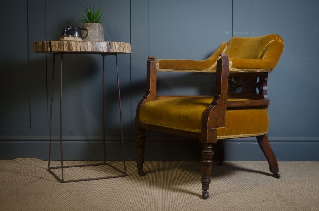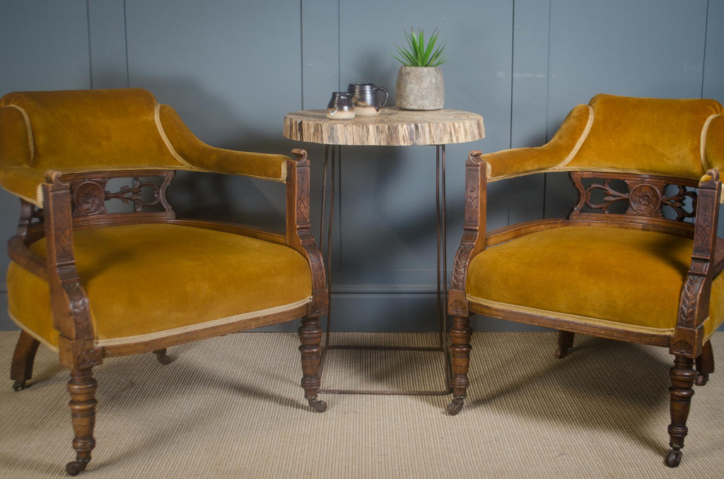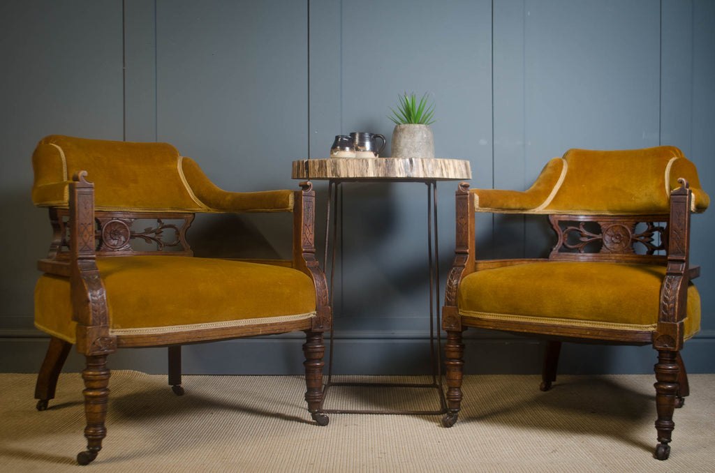 Pair of Edwardian velvet upholstered chairs in exceptional condition. Hardwood frames with beautiful carved freeze lower backs, porcelain castors and traditional upholstery in a mustard velvet. Some minor marks to the seats that are only noticeable when looking closely. Perfect for a bedroom or as extra seating in a lounge. The scooped back and sprung seats make these chairs very comfortable.