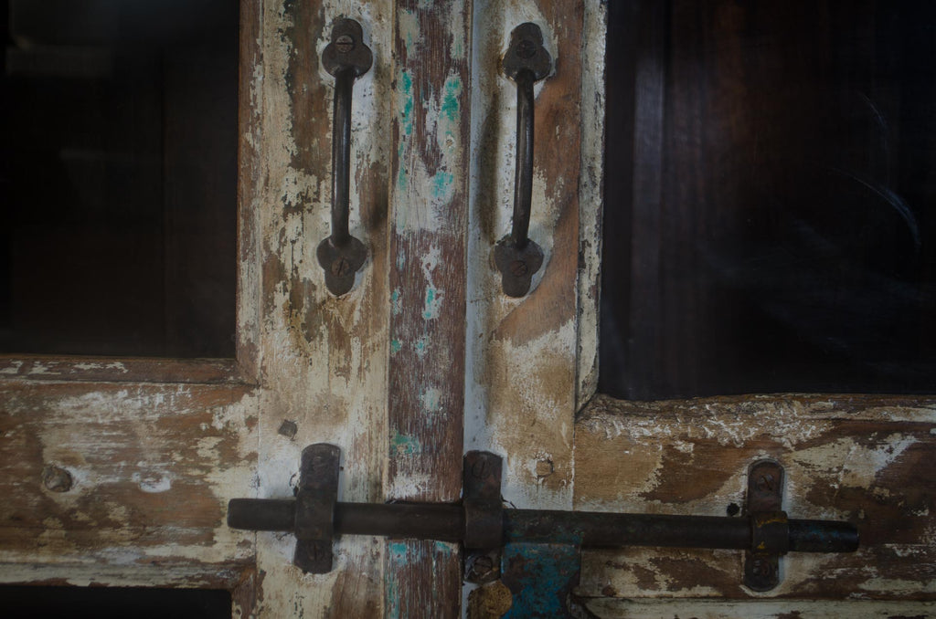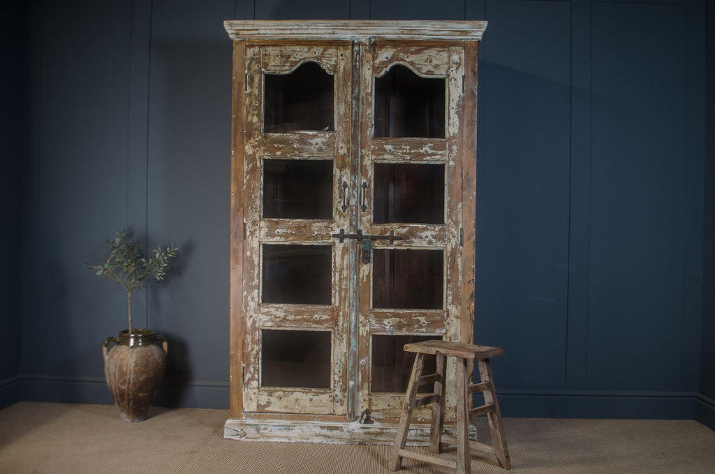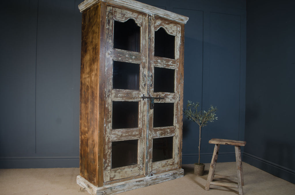 Bring timeless character and rustic elegance to your home with this stunning antique Indian dresser. Crafted from solid wood, this unique piece features glazed double doors with original iron bolt latches and beautifully carved shaped door tops, showcasing the charm of authentic Indian craftsmanship. The stripped painted finish reveals layers of history, giving the dresser a distinctive limed wax look that highlights its natural grain and aged patina. Inside, the shelved interior provides ample storage or display space - perfect for glassware, books, or decorative pieces.