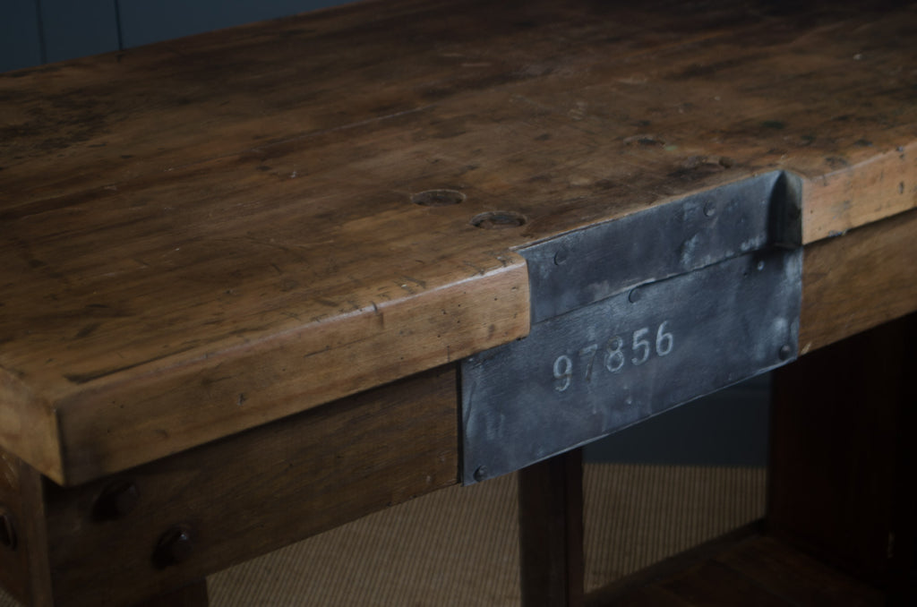 Transform your home with this beautifully restored reclaimed carpenter’s workbench, thoughtfully re-worked into a unique rustic kitchen island. Ample handy storage drawers, solid oak top, an open compartment for display or kitchenware, and a dedicated space for a stool, allowing it to double effortlessly as a kitchen prep area, informal dining spot, or functional desk. Its authentic time worn oak & pine wood has been sympathetically stripped and polished to bring showcase warmth of the grain, drawers re-worked, strengthened & label holders added. A great fun rustic piece for anyone looking to add a unique touch to their kitchen or office. Some signs of old worm holes that have been treated as a precaution.